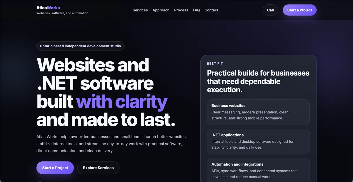 A better website, less manual admin, improved software stability, or a clearer system connecting the parts already in use. Atlas Works is positioned for that practical middle ground between marketing presence and operational tooling.